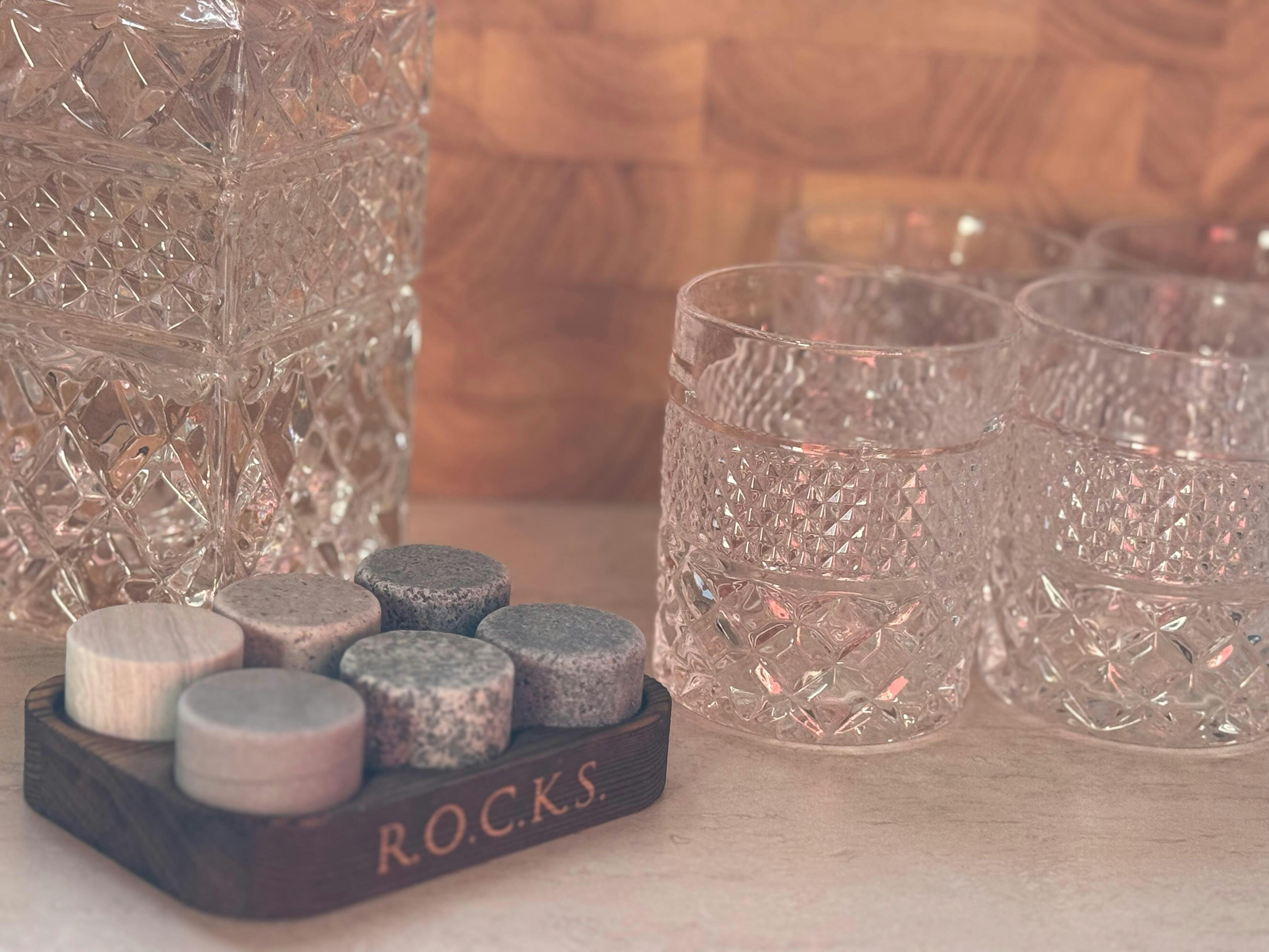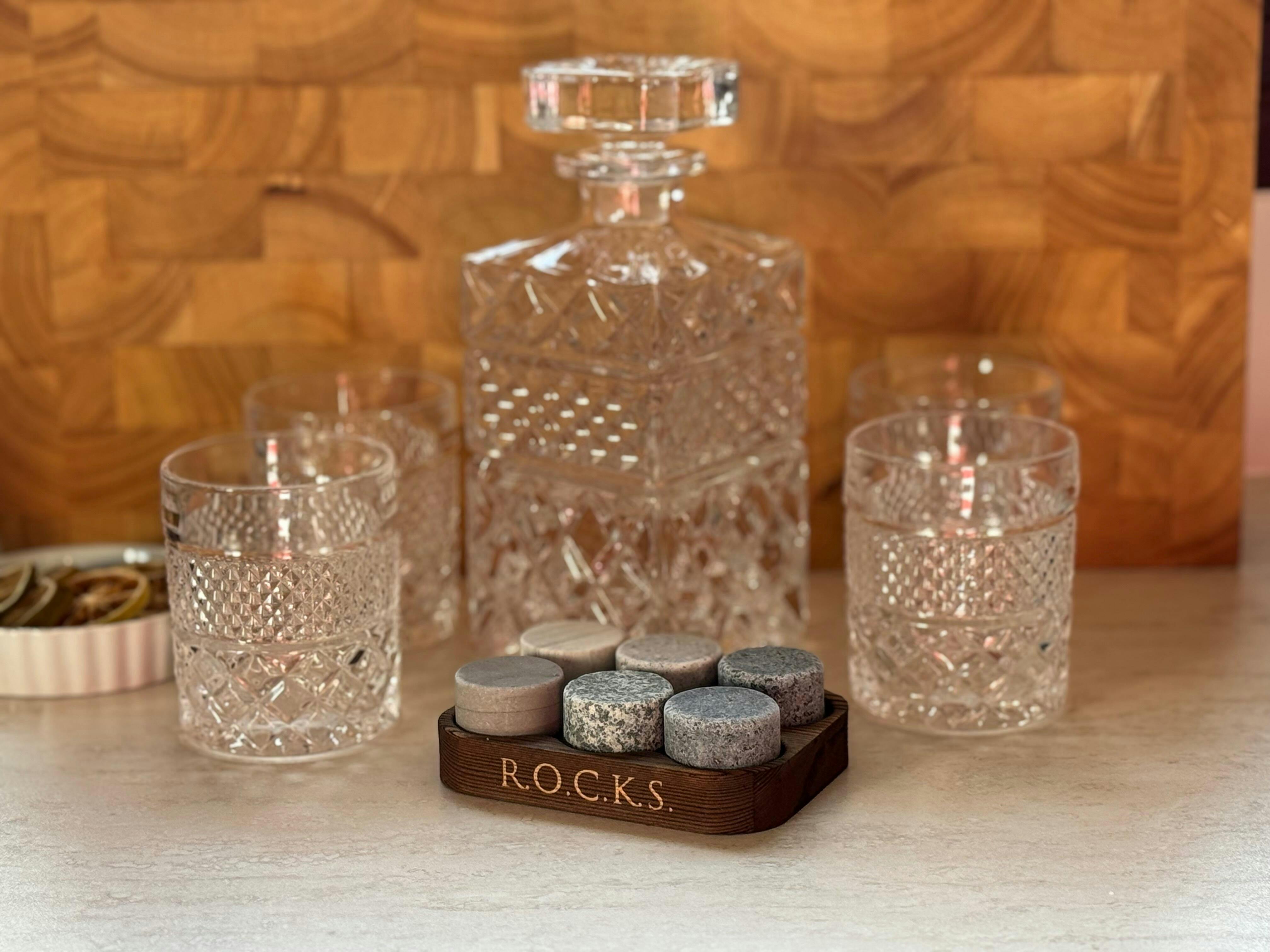 Our elegant decanter set with matching glasses is ideal for those who don't just drink whiskey, but celebrate it. The stylishly cut decanter with its star pattern brings out the golden reflections of bourbon, cognac, or brandy. Our popular granite chilling stones complement the set – stylish, reusable, and non-diluting!